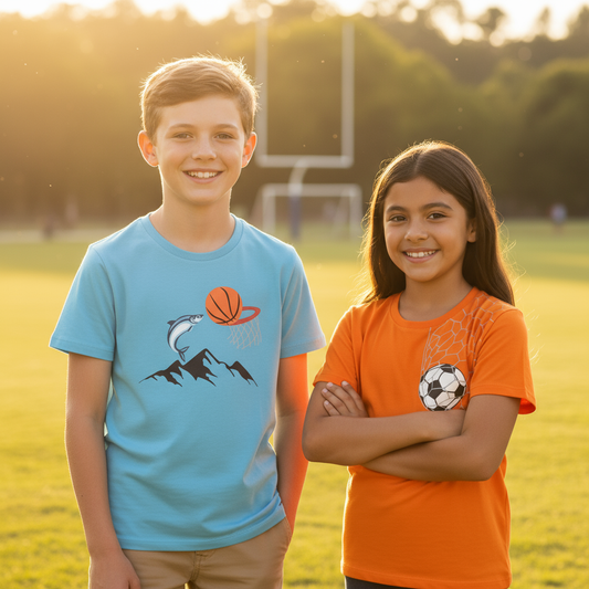 My Bow Sporty Vibes Combo T-Shirt for Boys, Cotton, Short Sleeve, Soccer Ball and Basketball Design, Set of 2, Blue and Orange (Ages 4-14 Years)